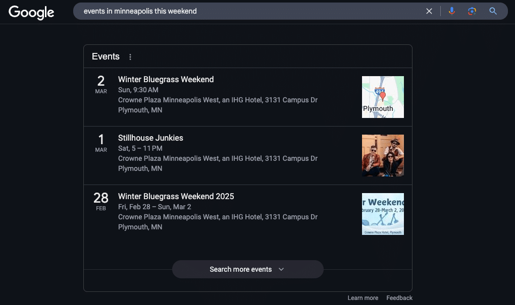 See this list of events? They’re in this special box in Google results because they’re listed on pages that use event schema: