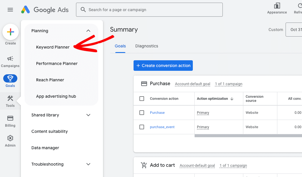 To open Google Keyword Planner, click Tools in the left navigation.