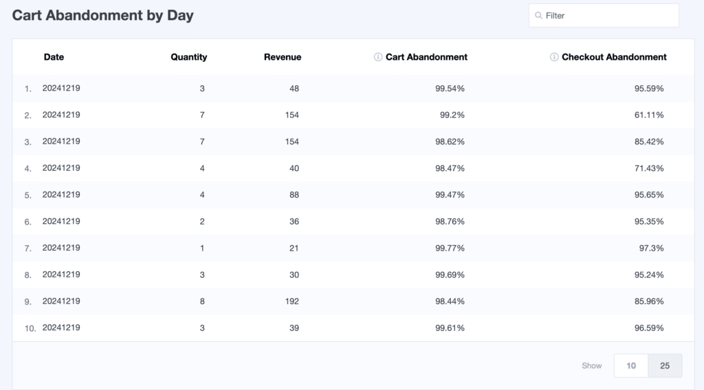 In the second cart abandonment report, you’ll find total cart abandonment data by day: