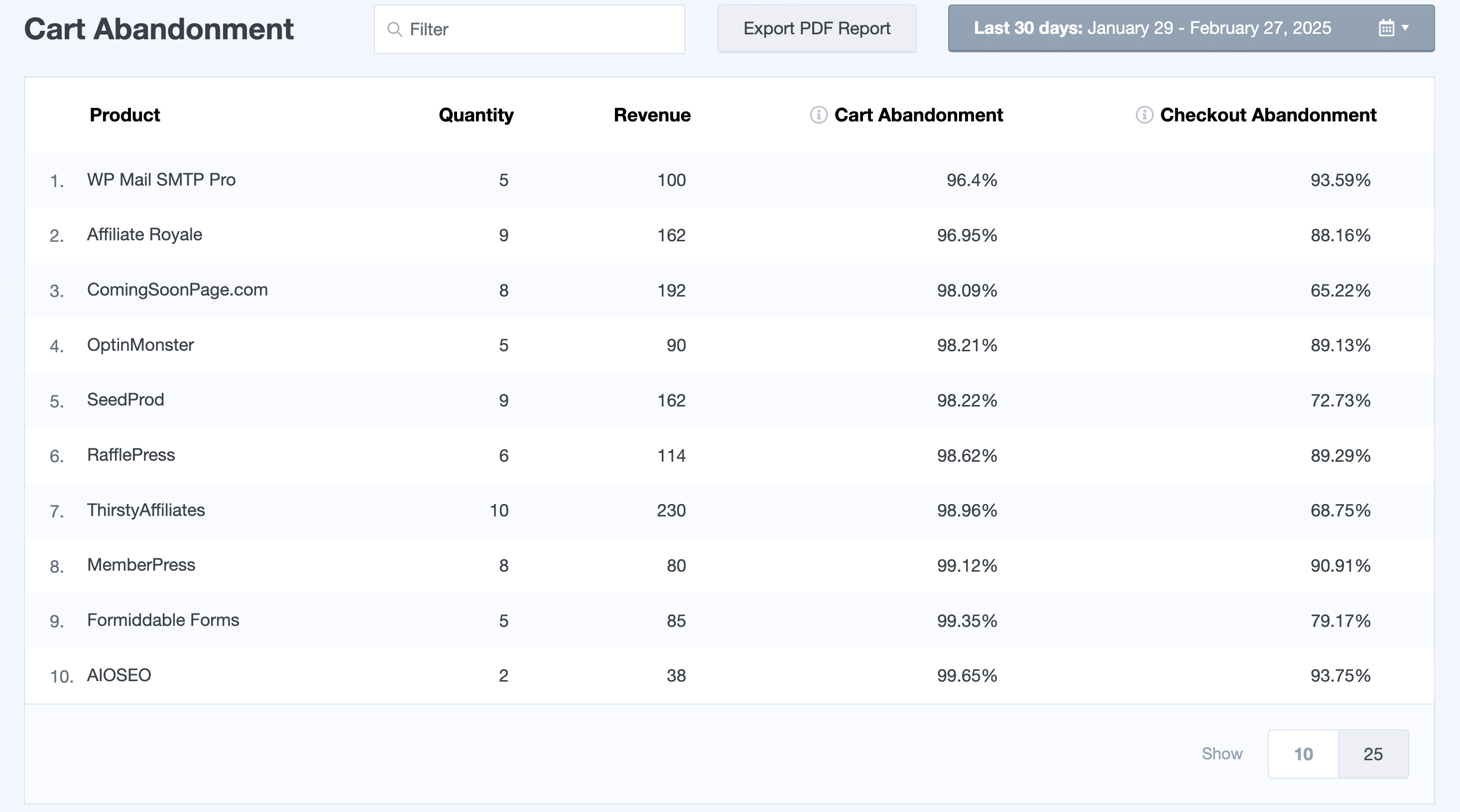 Cart abandonment isn’t very easy to track using Google Analytics, so we create two different cart abandonment reports for your dashboard. In the first report, you’ll see which products were in those abandoned carts, including lost revenue and the cart abandonment percentage: