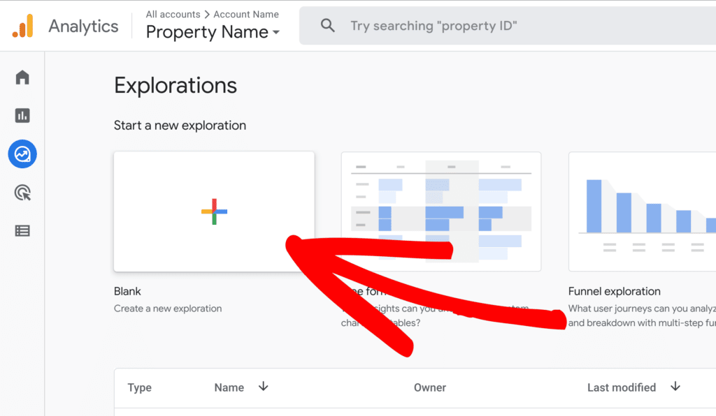 First, navigate to the left sidebar in GA4, go to Explore, and create a blank report.