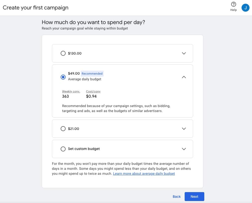 Finally, in this campaign setup section, you’ll set a budget. Google will help you out by suggesting one based on the keywords and conversion you chose, but you can change it to anything you want.
