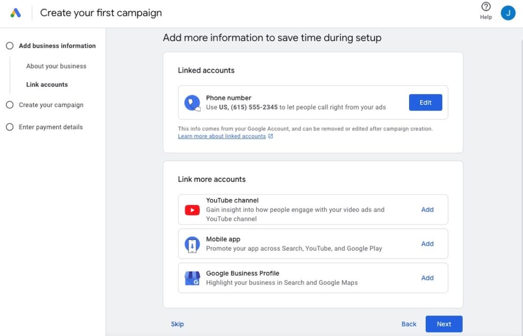 On the next screen, you’ll have the chance to link any accounts to your Google Ads that you’re going to need, including adding your phone number (if you want any of your ads to include your phone number):