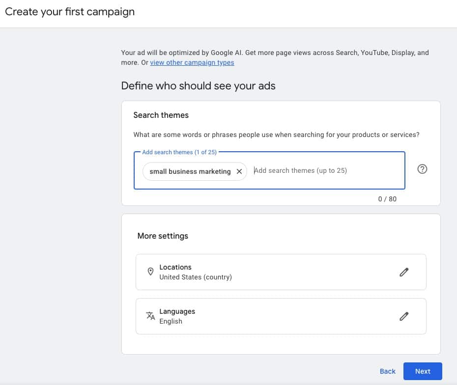 On the next page, you’ll need to enter search themes. These are essentially keywords and topics. When you start typing in a topic, Google will give you suggestions. For example, if you want to show your ads to marketing professionals at small businesses, you might use the keyword “small business marketing.” Hit enter after each keyword or phrase to use it in your campaign. You can add up to 25.