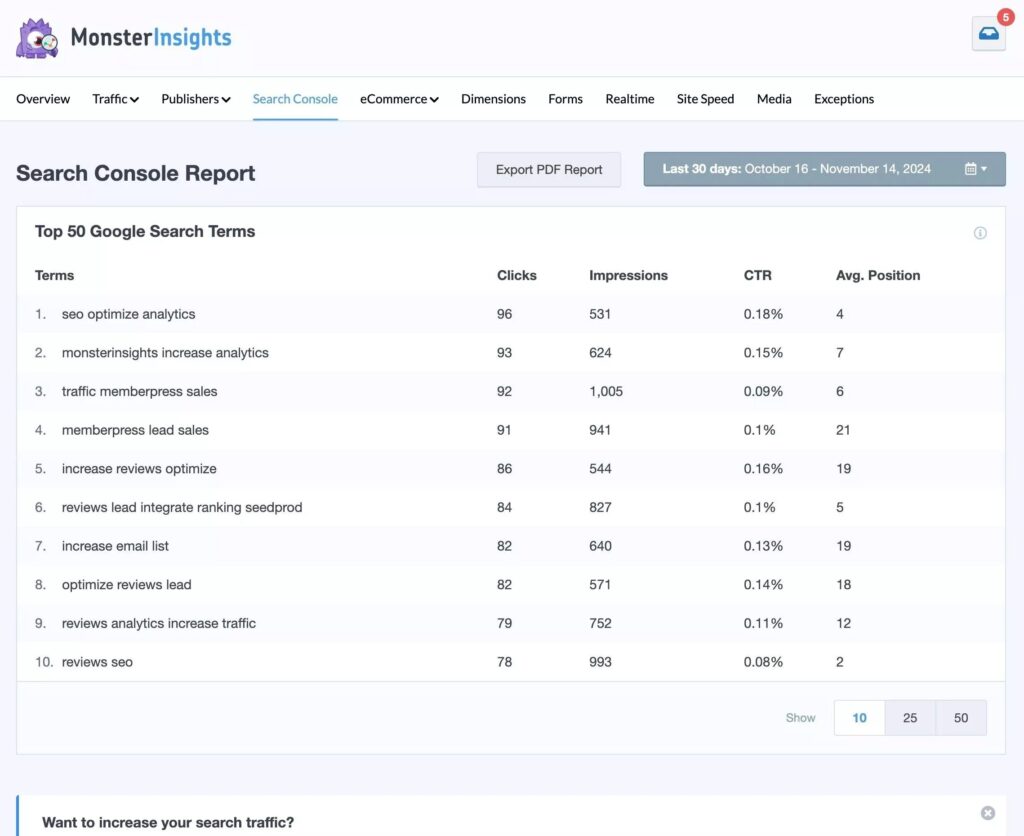 MonsterInsights integrates with Search Console so you can see the top 50 organic keywords that are driving traffic to your website inside your dashboard. Use the report to help inform your keyword research for your Google Ads campaigns.