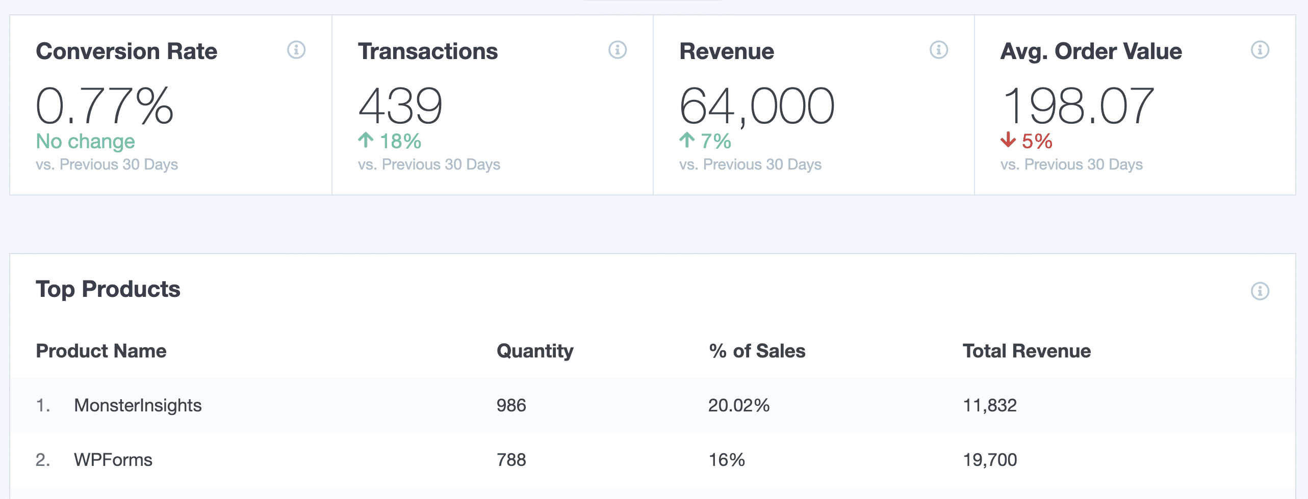 If there are potential problems with your website’s key metrics and stats, MonsterInsights will share periodic notifications within this report. Available after enabling the Exceptions addon.