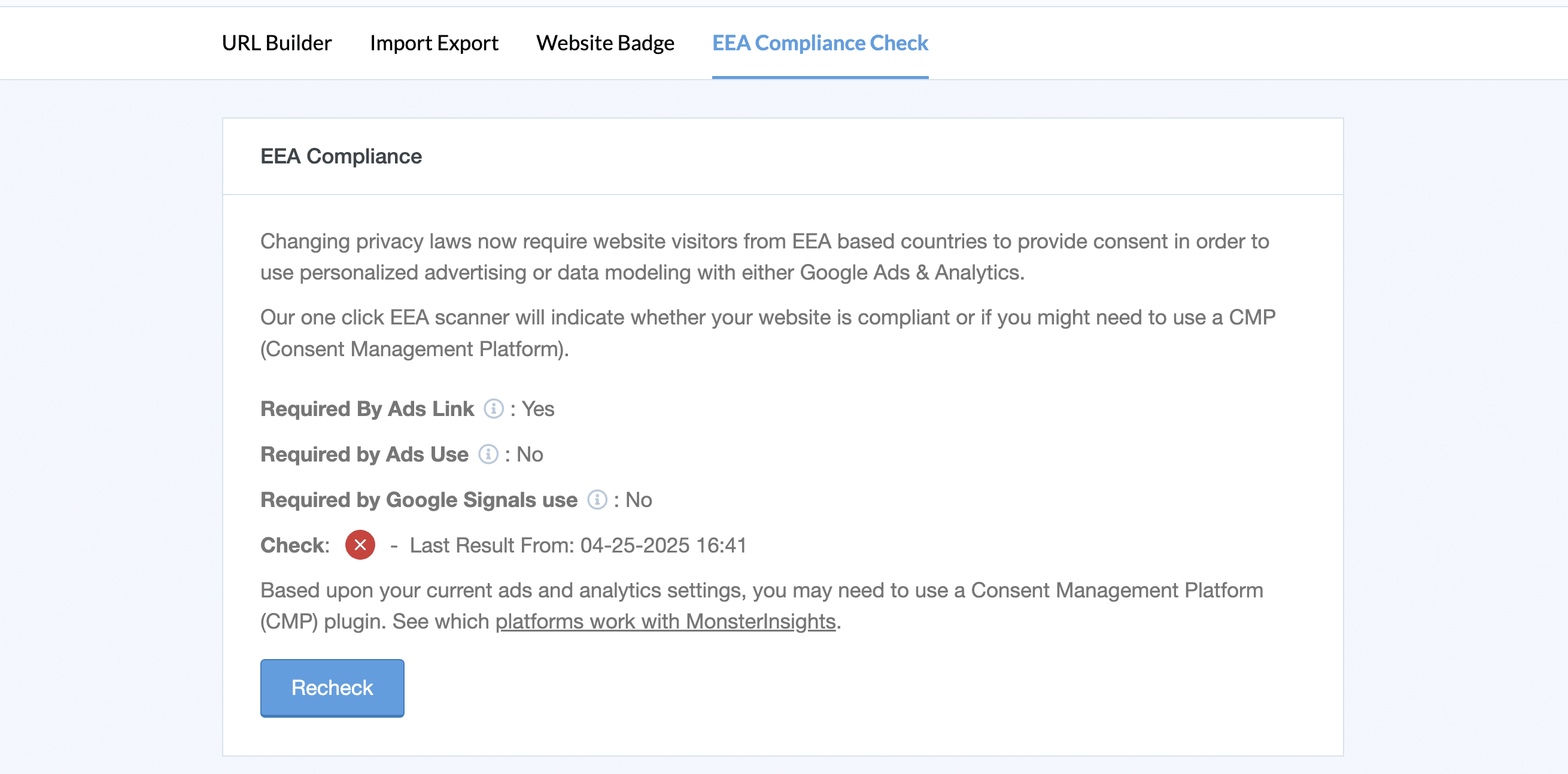 Use the EEA Compliance checker to see if you need a consent management system at Insights » Tools » EEA Compliance Check.