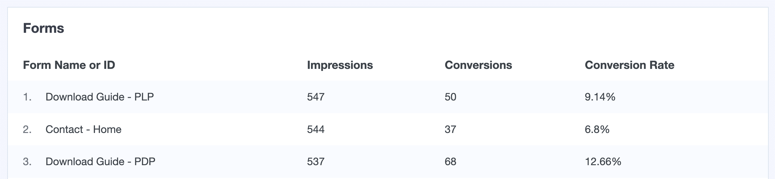 Monitor your user engagement and lead generation by how well your forms are performing. Available after enabling the Forms addon.