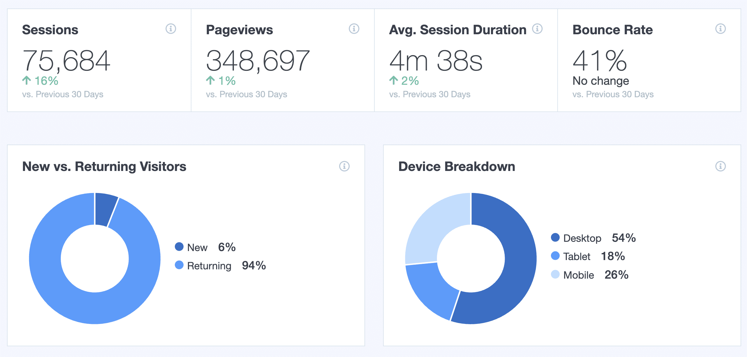 Quickly get a glimpse of your site visitors and how they interact with your site. Easily grasp trends overtime to identify successful strategies or potential issues.