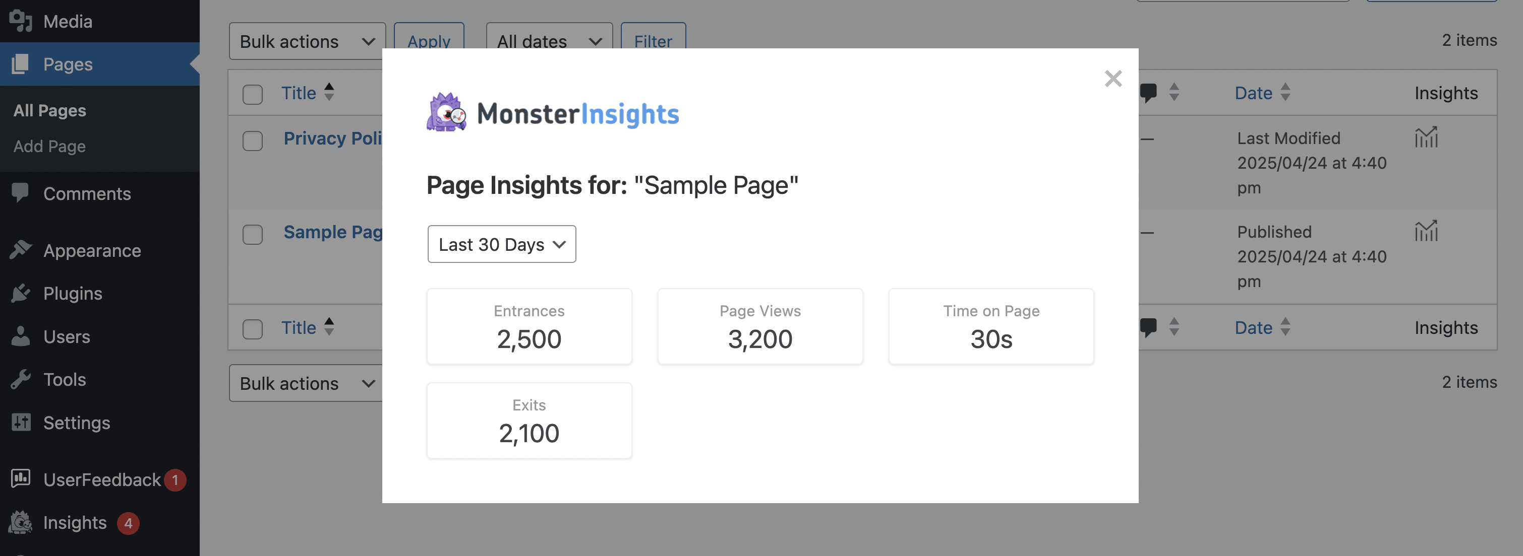 See Page Insights for your posts or pages. Enabling the Page Insights addon will add a new column to your posts or pages, allowing you to view quick stats per post or page.