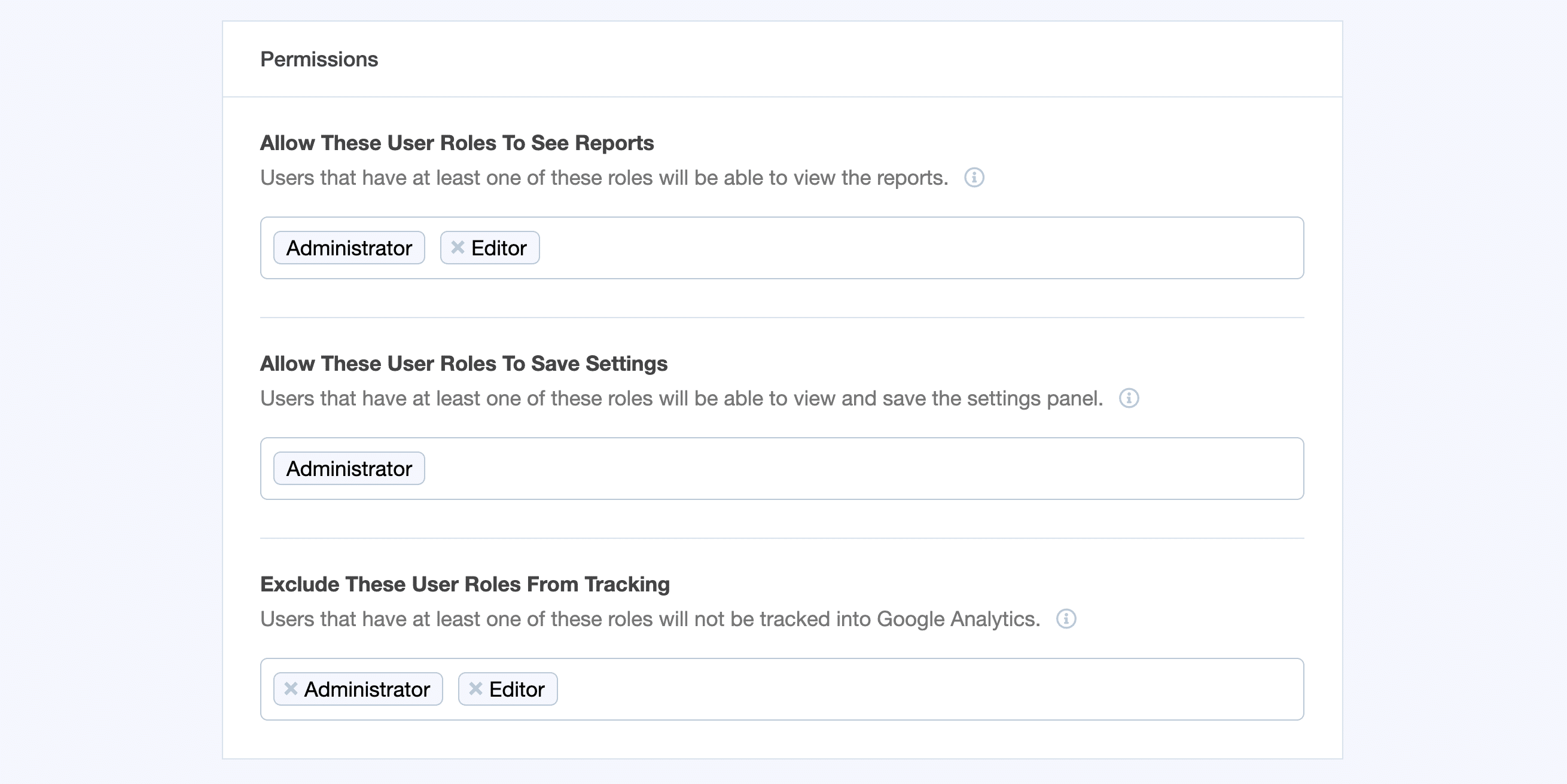 Manage user roles or permissions in case you have a marketer or a client that would like to help review reports at Insights » Settings » Advanced » Permissions.