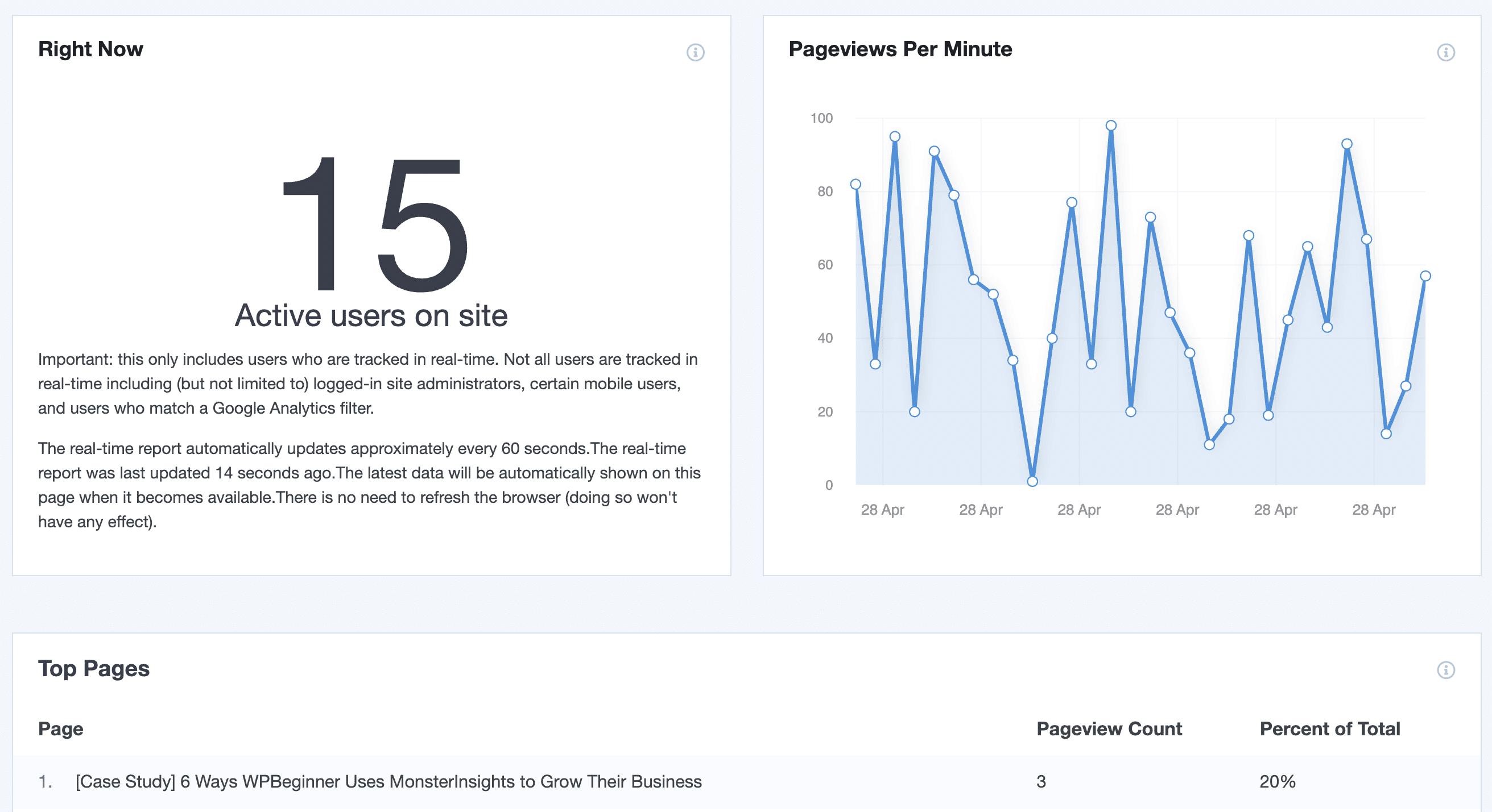 After connecting with Google Analytics, you’ll begin tracking data through MonsterInsights. As data is being collected, you can easily monitor site performance by going to Insights » Reports.