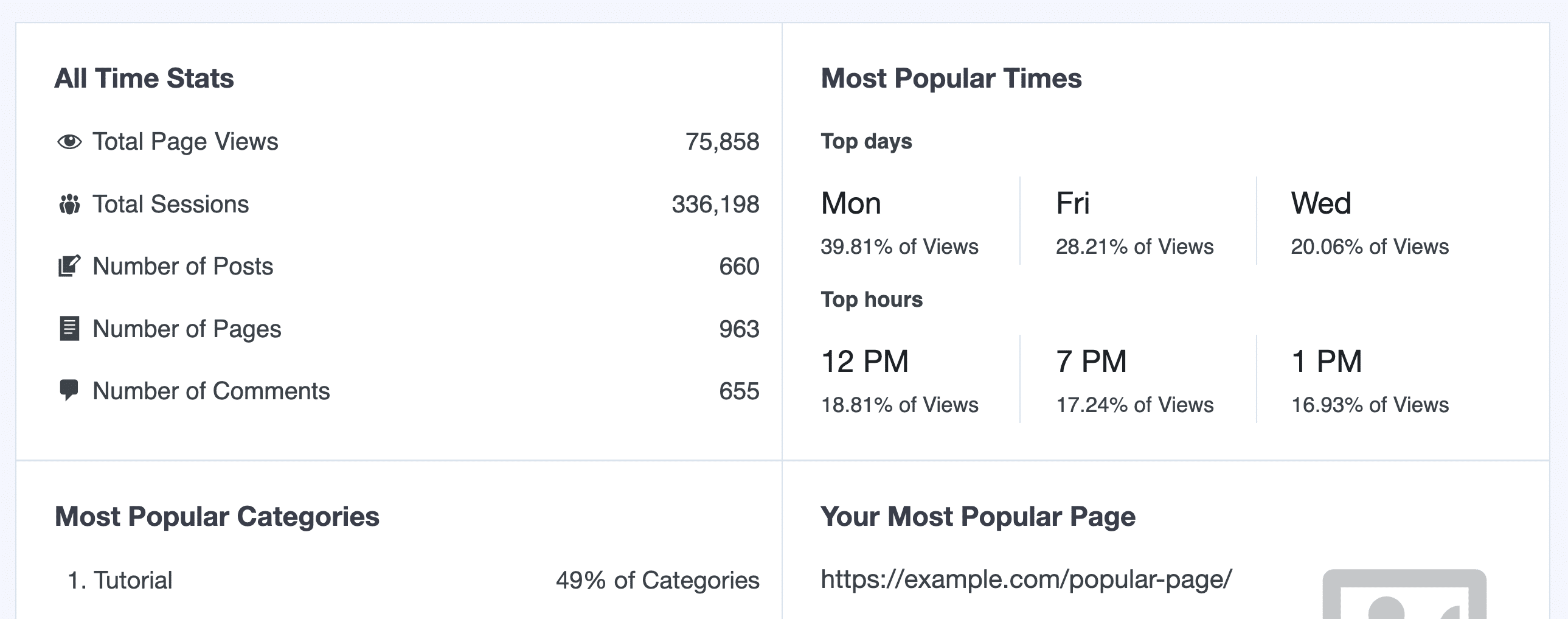 View stats at a glance to see how much traffic your site has accumulated over time through the number of your total page views, sessions, numbers of posts, pages, comments and most popular times in your Stats at a Glance report. This report is unique as it displays Google Analytics data for all time (no set date range).