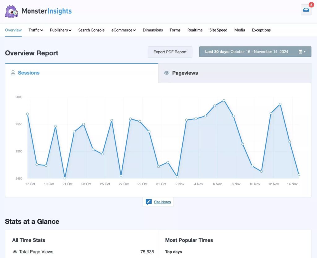 Instead of bouncing between WordPress and Google Analytics, you can view all your essential metrics right in your WordPress admin area. MonsterInsights provides: