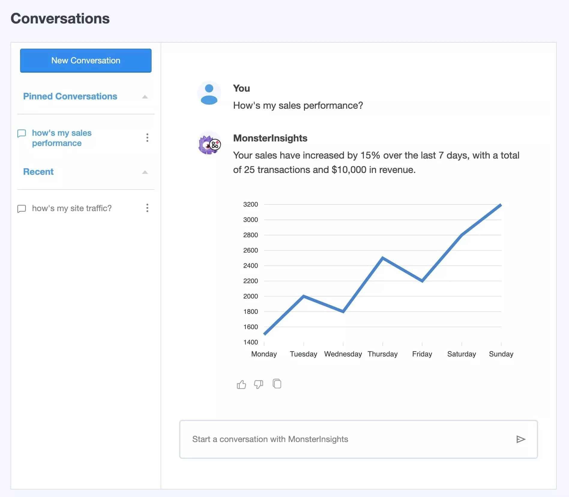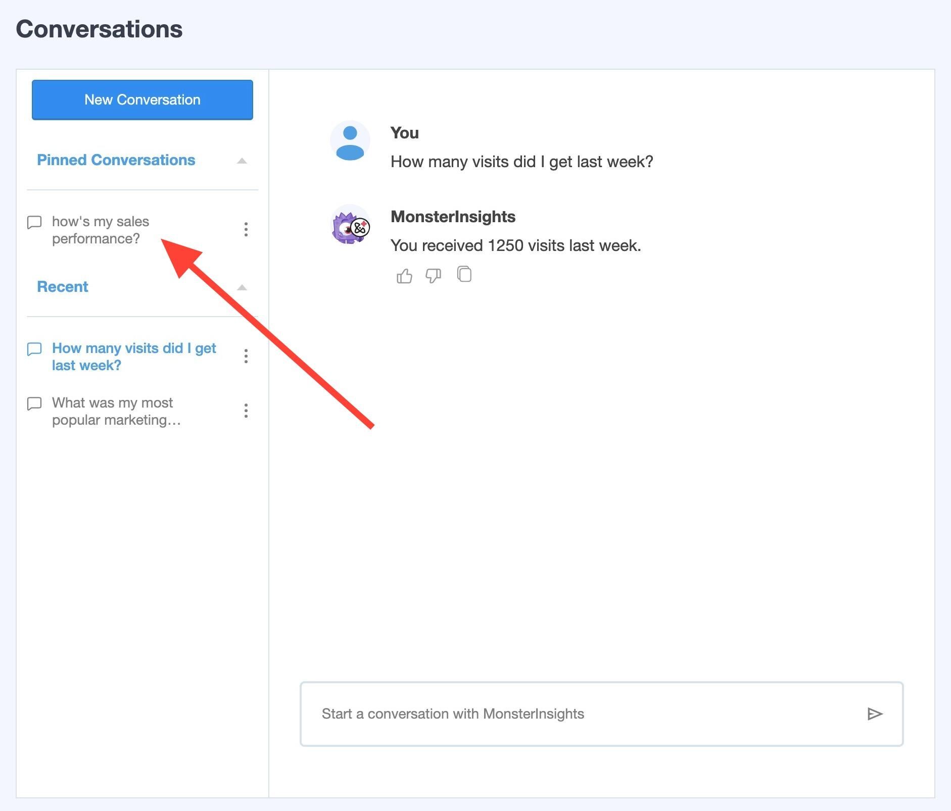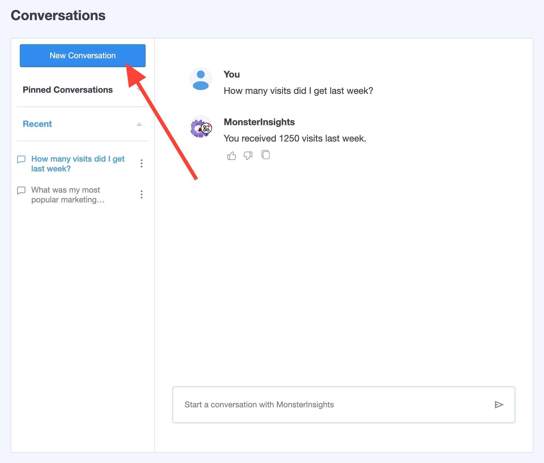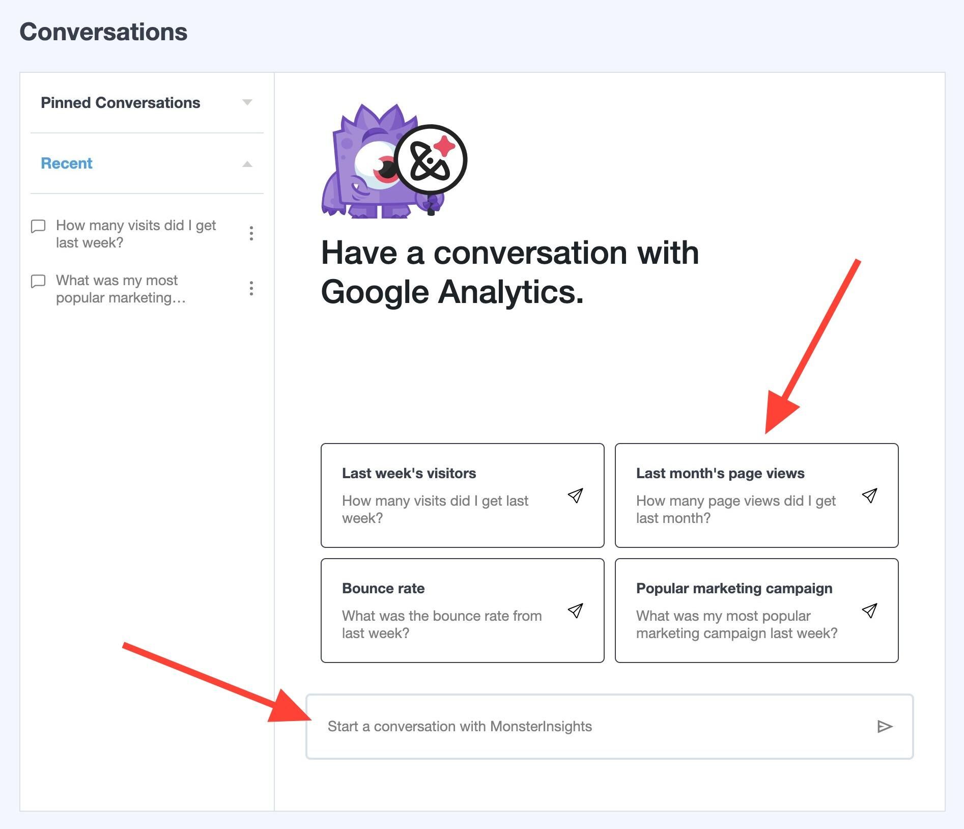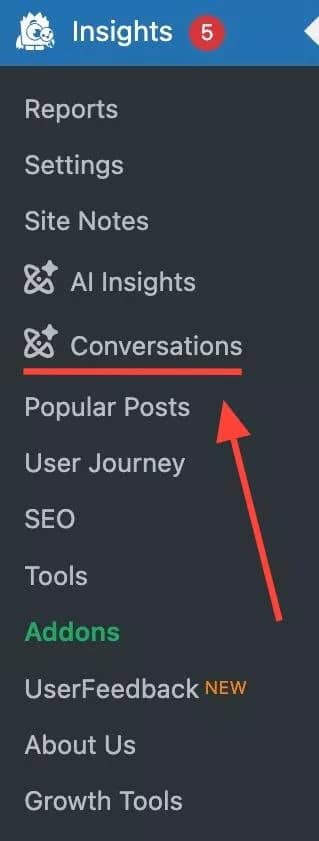Click into the page Insights » Conversations and start a conversation with MonsterInsights.