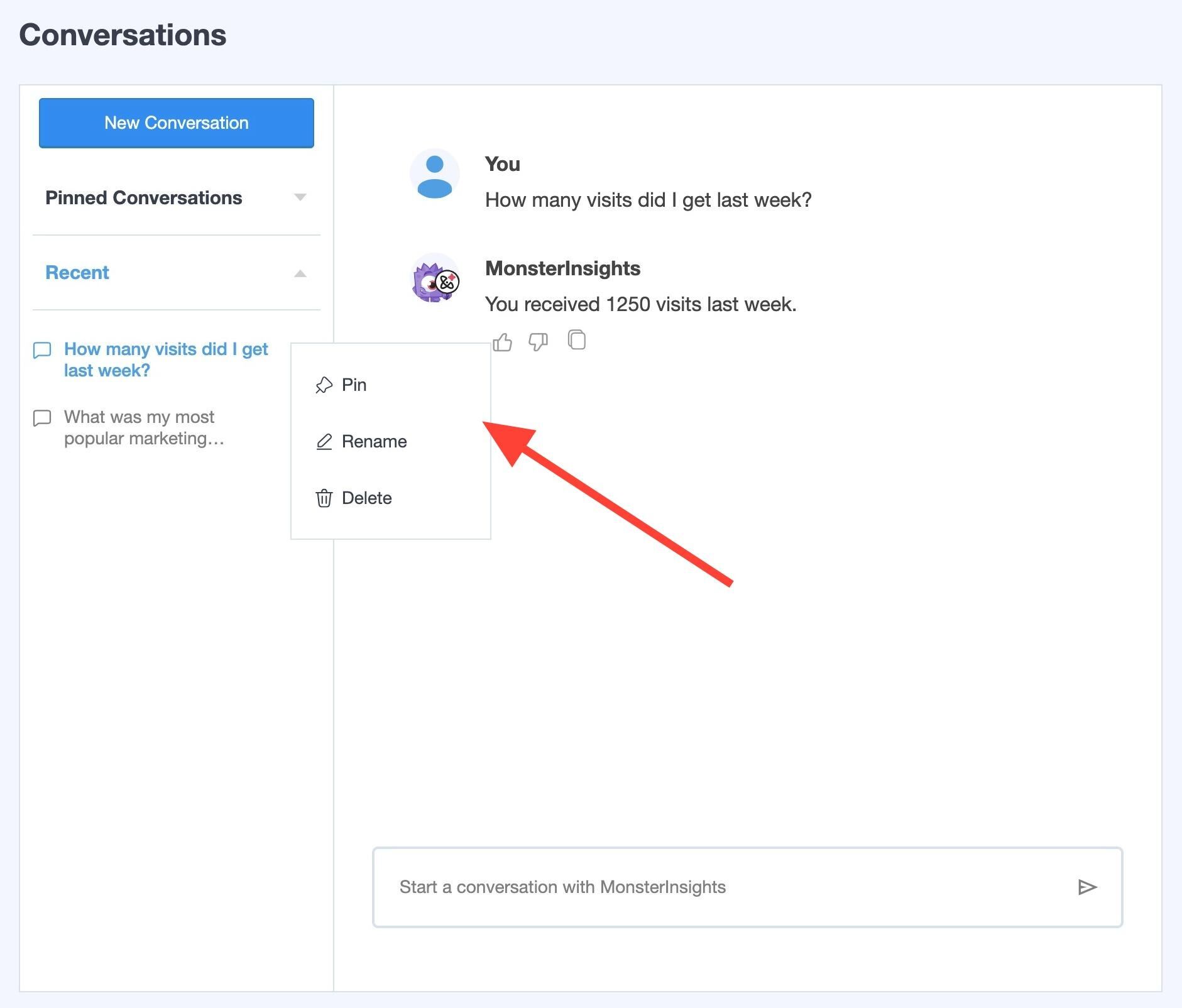To keep things organized, you can Rename conversations or Delete ones you no longer need. Click on the 3 dots next to the title of the conversations to view these options.