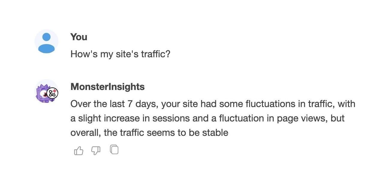While chatting with MonsterInsights, for any answers you find clear, easy to understand and helpful, click the Thumbs Up icon. For any answers that seem incomplete or are not accurate, let us know by clicking on the Thumbs Down icon, while sharing any details about what didn’t go right. Your help in fine-tuning analysis is really appreciated!