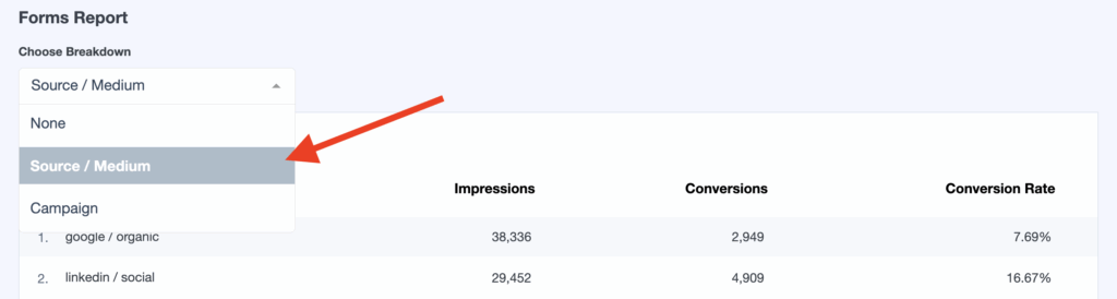 Lastly, you can choose a breakdown of the Forms report by clicking on the following dropdown: