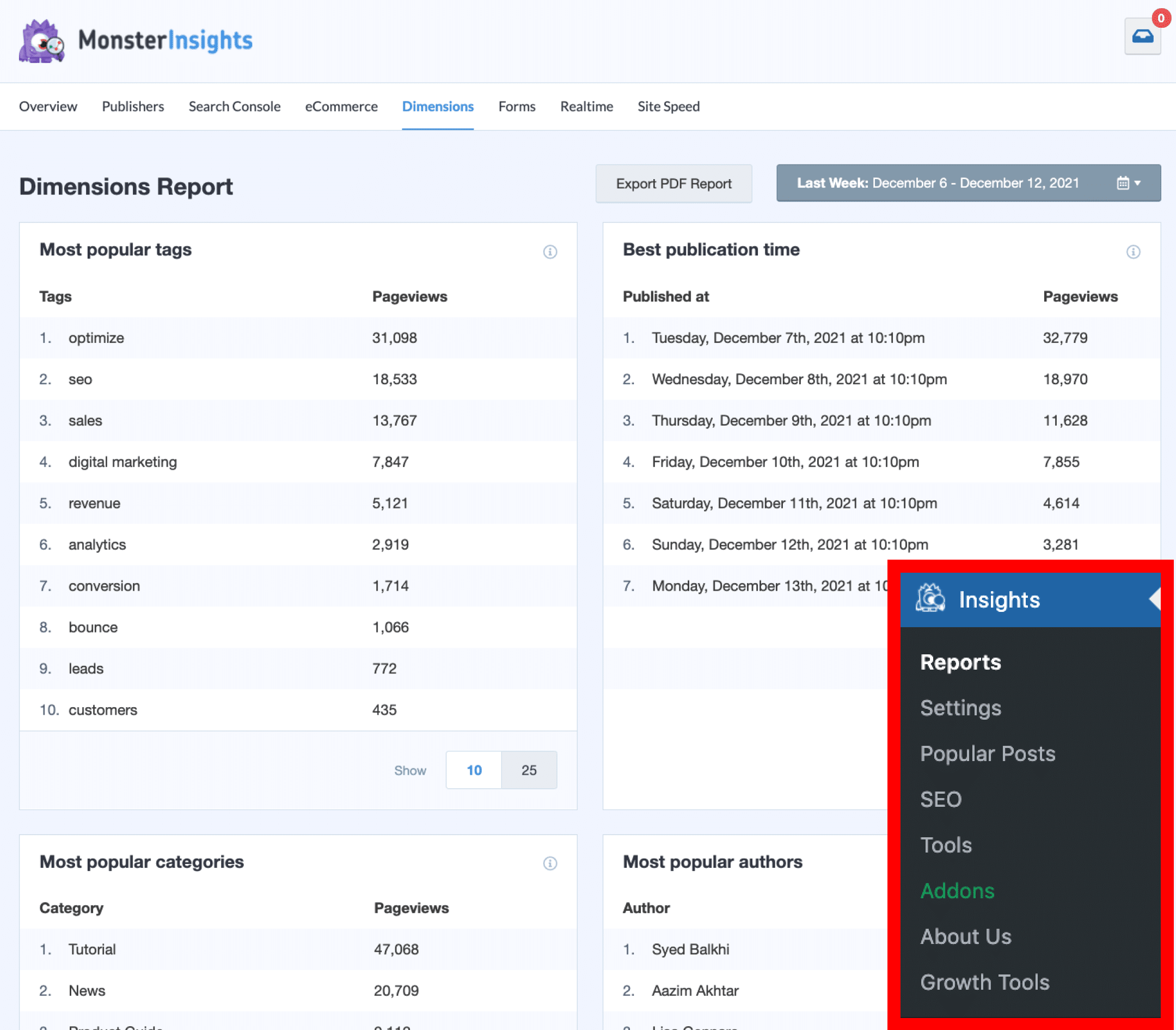 With Custom Dimensions, you can choose to track custom data not typically included in vanilla Google Analytics, and display it in your MonsterInsights dashboard and reports. You can track performance for authors, categories, tags, searches, users, and more.