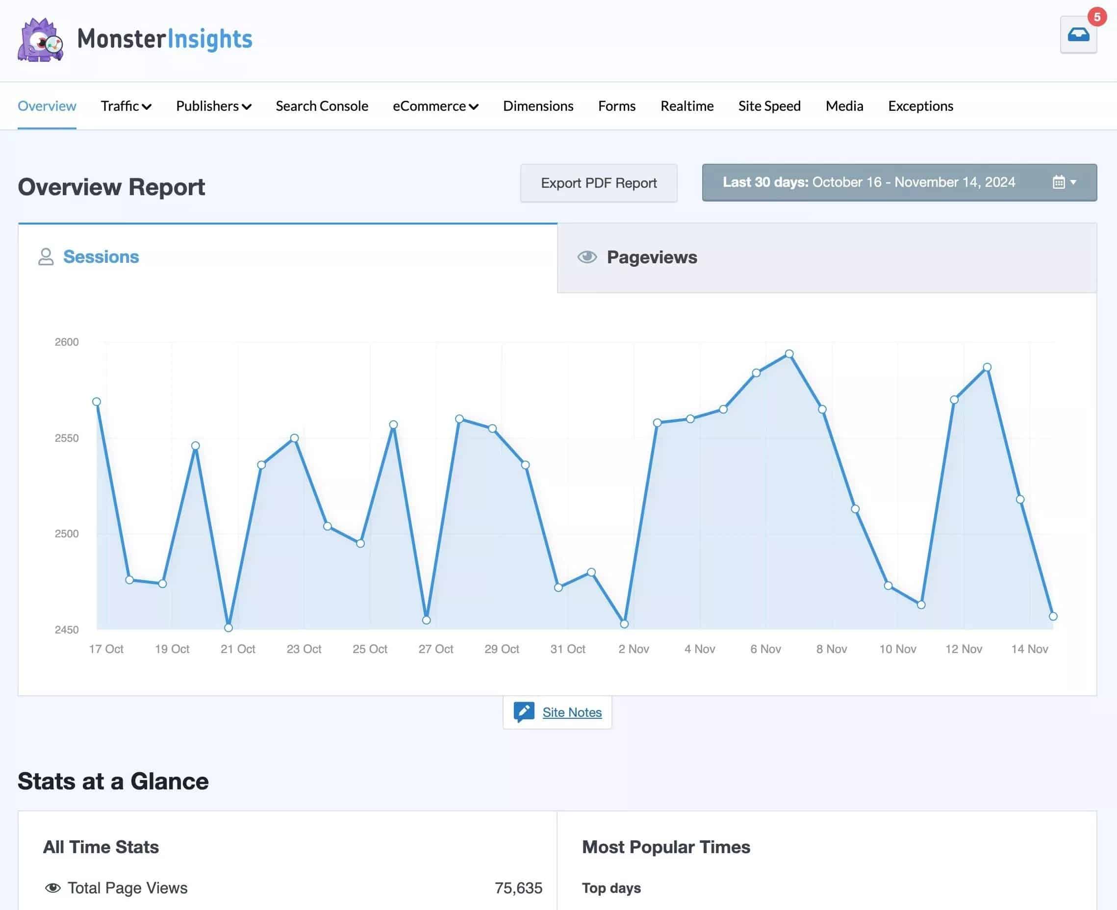 Beyond the Search Console report, MonsterInsights connects with Google Analytics to give you a whole dashboard full of straightforward, easy-to-read, powerful reports that you can access right inside WordPress any time for up-to-date metrics.