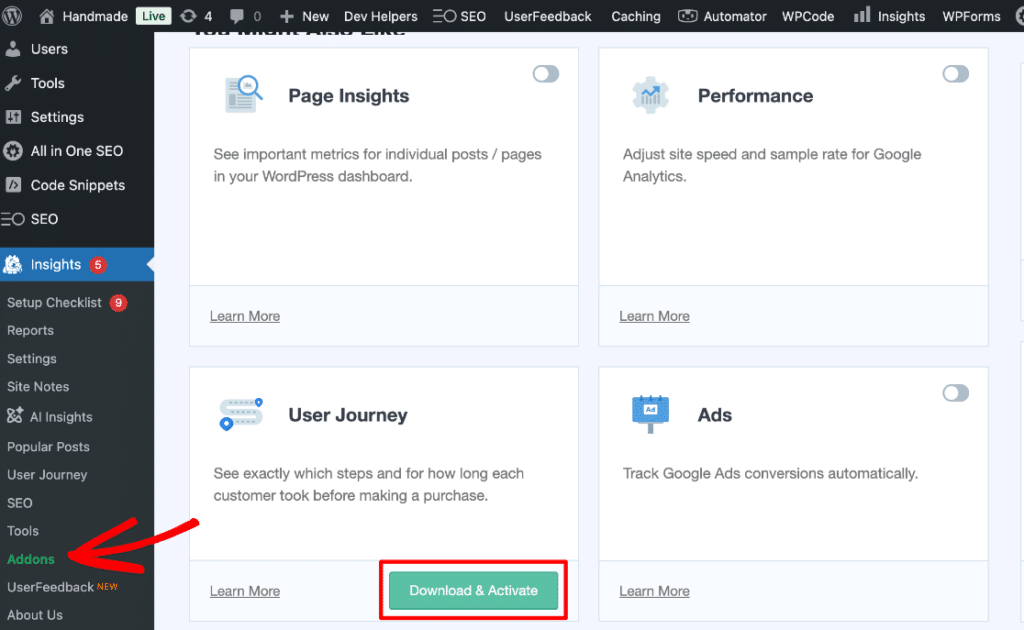 Find the addon by going to Insights » Addons in your WordPress dashboard and clicking Install.