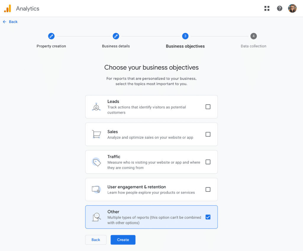 Finally, choose your business objectives. We suggest choosing Other to populate your account with all of the Google Analytics reports.
