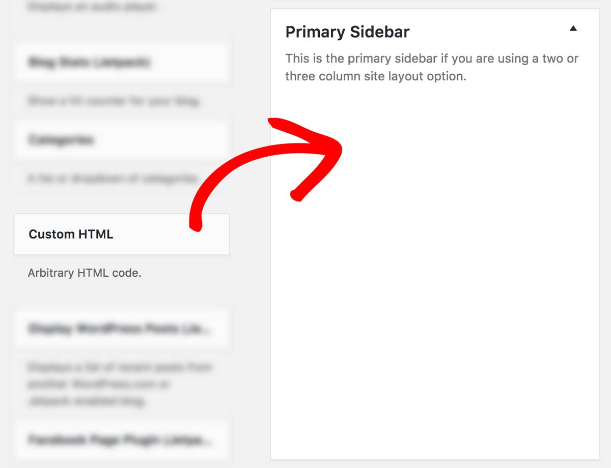 Step 2. Drag a Custom HTML Widget to the Sidebar of your theme if you have one (or any other Widget section, such as the footer, if you don’t).