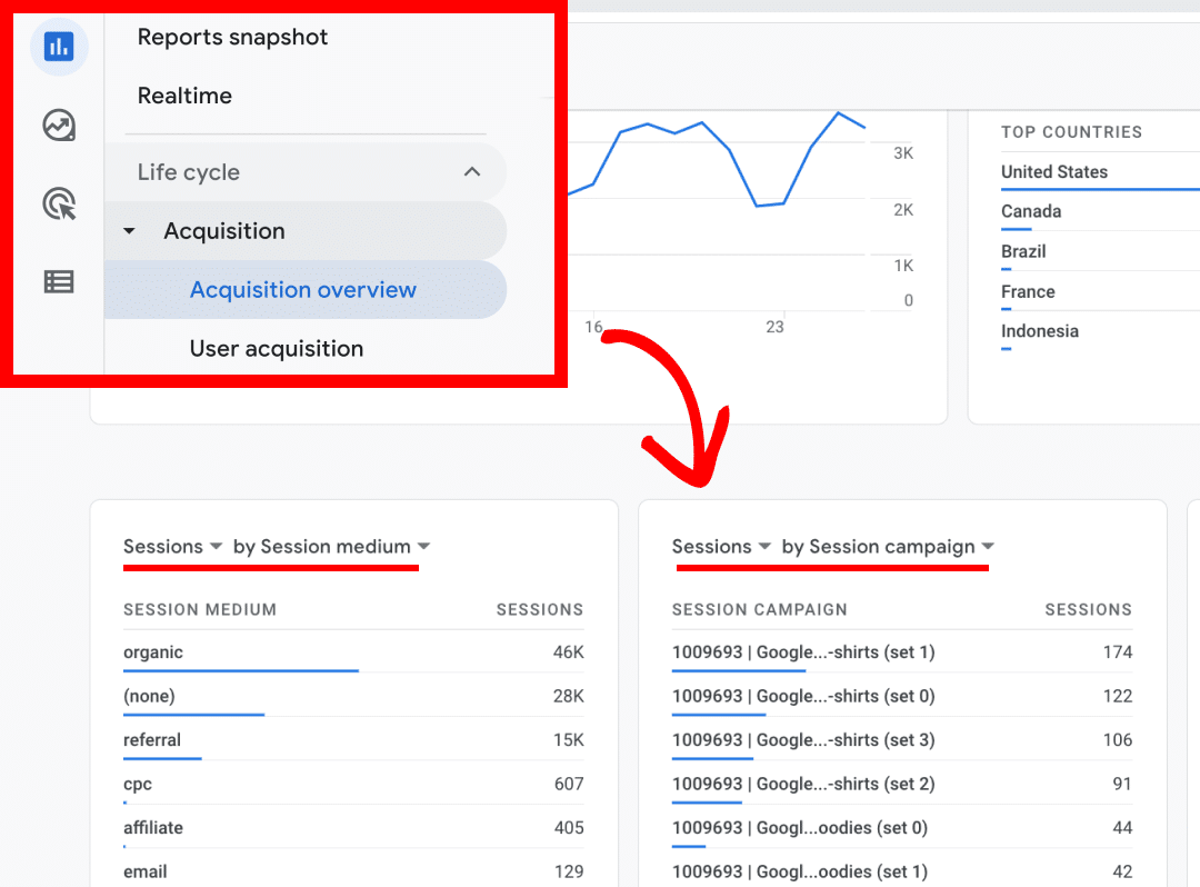 To find your UTM data in your Google Analytics property, navigate to analytics.google.com » Reports » Acquisition (under Life cycle).