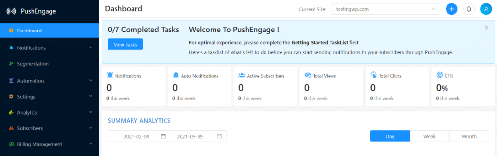 Once you’ve created an account, you’ll be taken to your PushEngage dashboard.