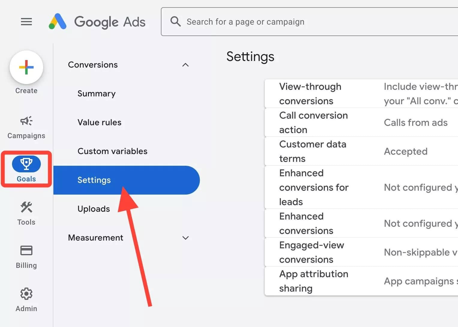 First, the option needs to be enabled within your Google Ads account. Visit your Google Ads dashboard at ads.google.com and then navigate to Goals » Conversions » Settings