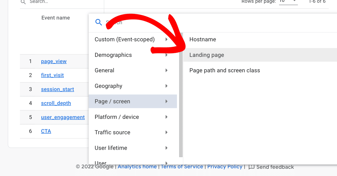 For example, if you open Page / screen and choose the custom parameter Landing Page, a new column will appear and you’ll see more information relating to your custom event.