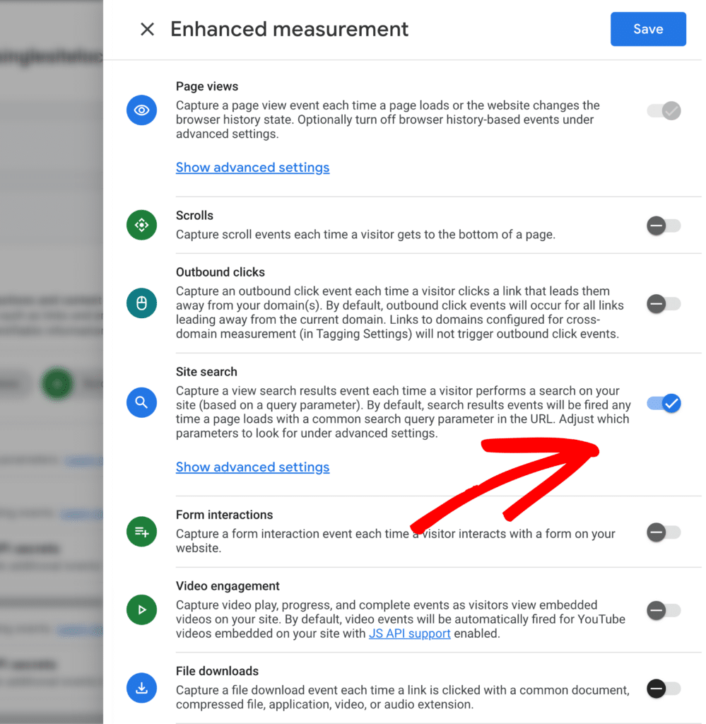 But to set up site search tracking, you can manually enable the option and then customize your enhanced measurement tracking to help measure Site search.
