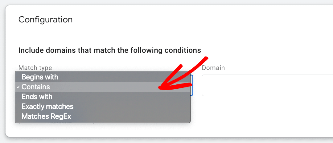 Here’s an example. Suppose you select Contains in the dropdown and type in “mycoolsite” in the Domain input field.