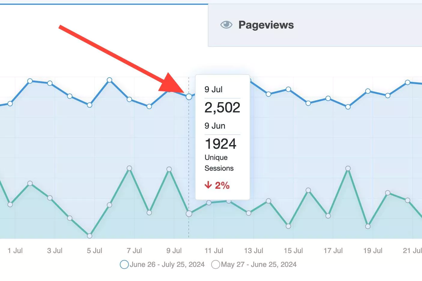 When viewing graphs, hover over a data point to view numbers of the current and previous date.