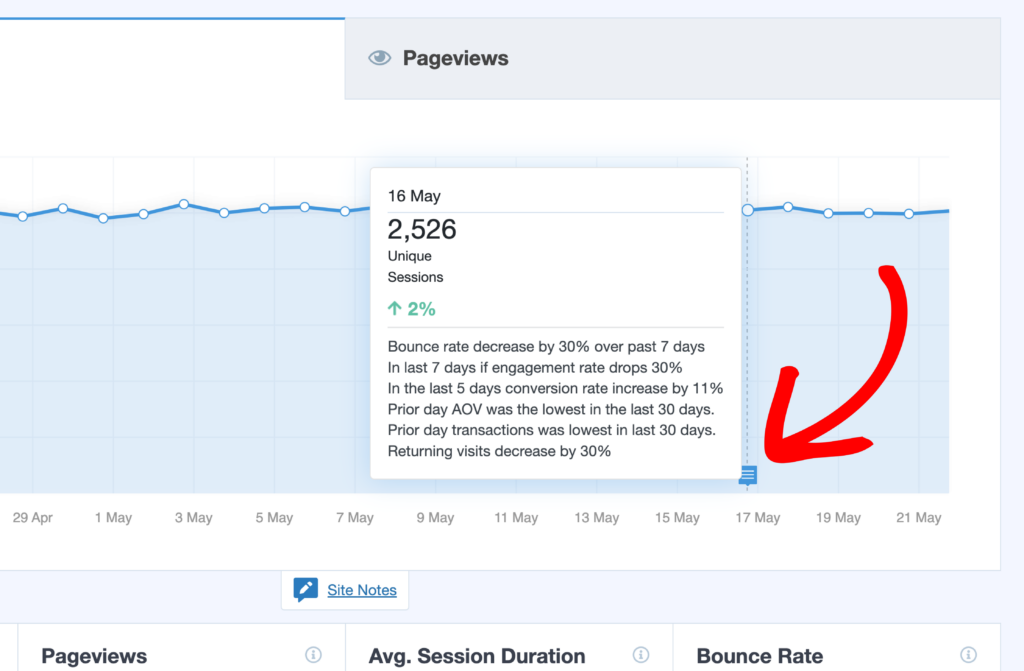 With the MonsterInsights Exceptions addon, you can automatically be notified of these changes through email alerts, site notes and dashboard notifications.