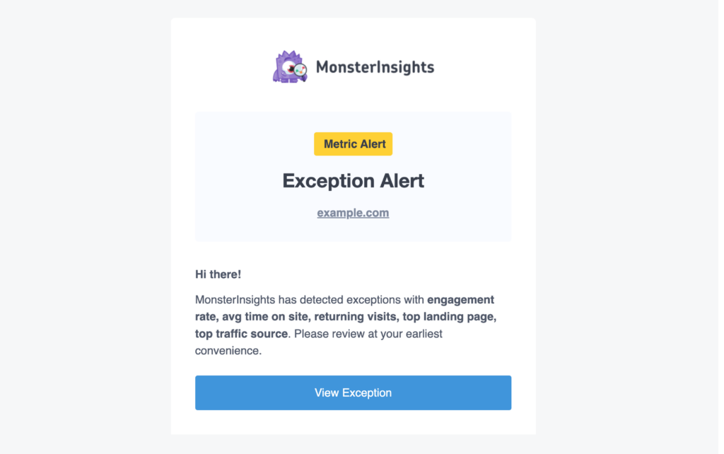 The MonsterInsights Exceptions tracking and reporting feature is designed to help you effortlessly monitor sudden changes in metrics such as conversion rates, traffic, transactions, engagement, and bounce rates, allowing you to quickly address potential issues.
