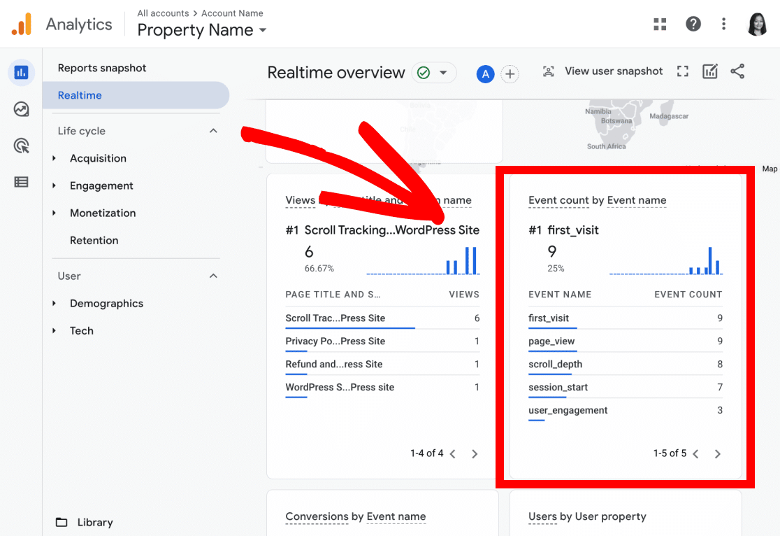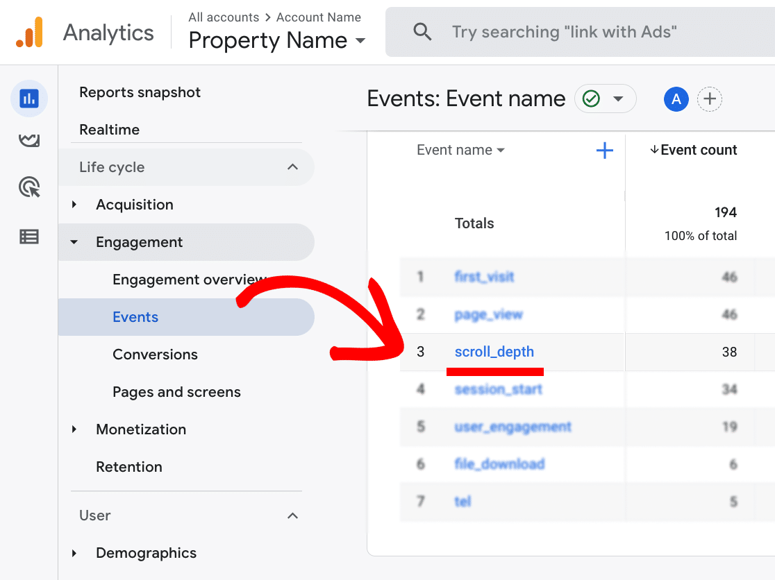 Step 2: Next, navigate to Reports » Life cycle » Engagement » Events and click on the Event name scroll_depth.