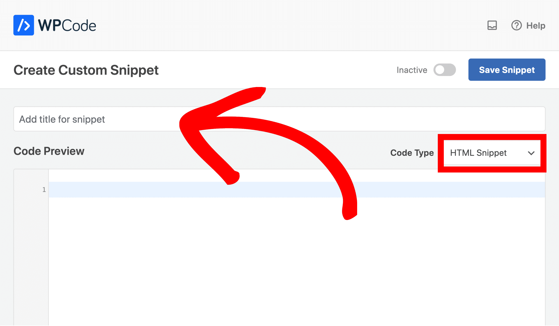 Step 4: Add a title for your new snippet, and set the Code Type to PHP Snippet.