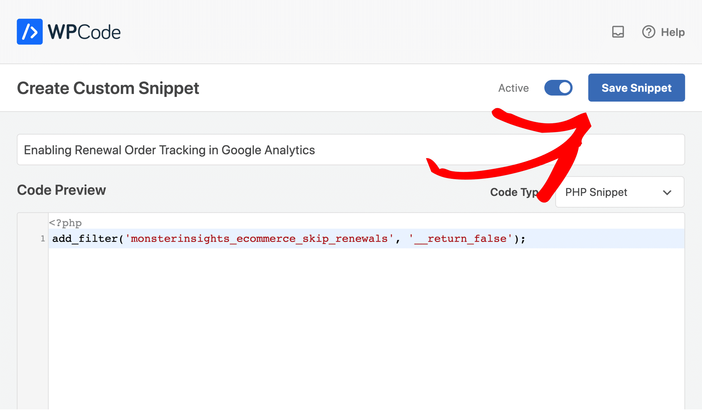 Step 5: Add the code snippet, switch on the Active toggle and Save Snippet.
