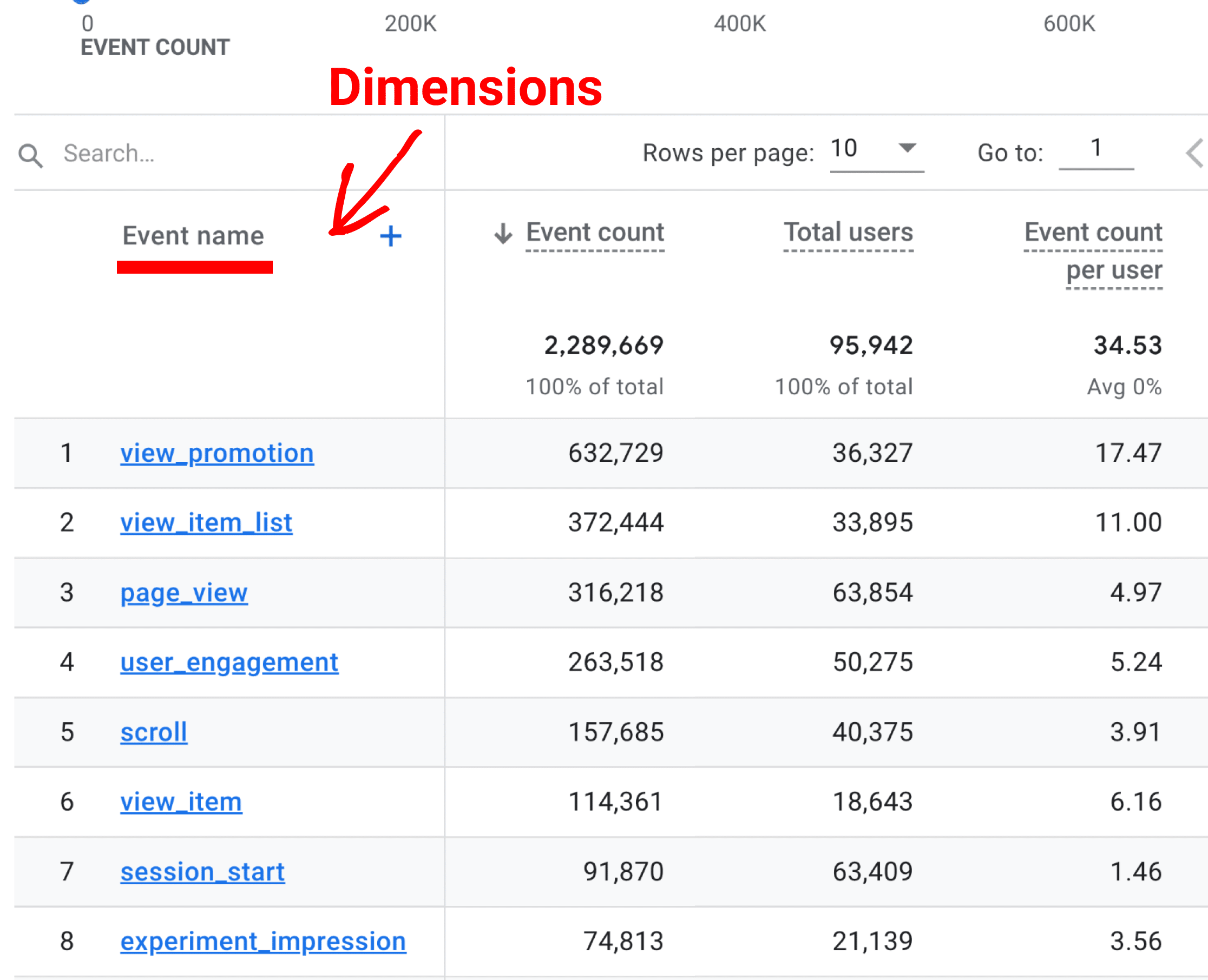 Next to the dimensions will be the quantitative measurements of that dimension, known as metrics, which can be numbers, averages or ratios. These will be found on the right side of reports or summary cards.