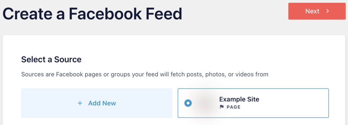 To create a custom Facebook feed, use the Facebook source you connected to in the previous step and click on Next.