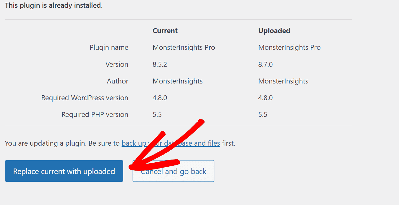 Click Replace current with uploaded to complete the installation of your new MonsterInsights version.