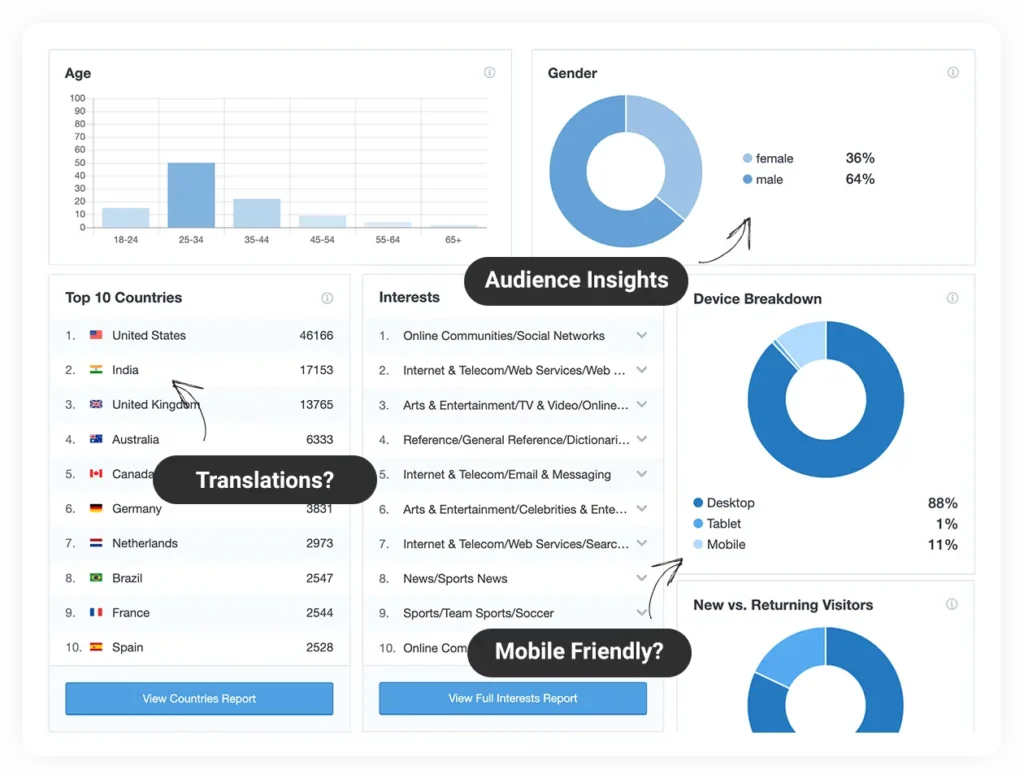 Our Audience Report shows you which countries your visitors are from, what they are most interested in, which device they are using, their age, gender, and a whole lot more.