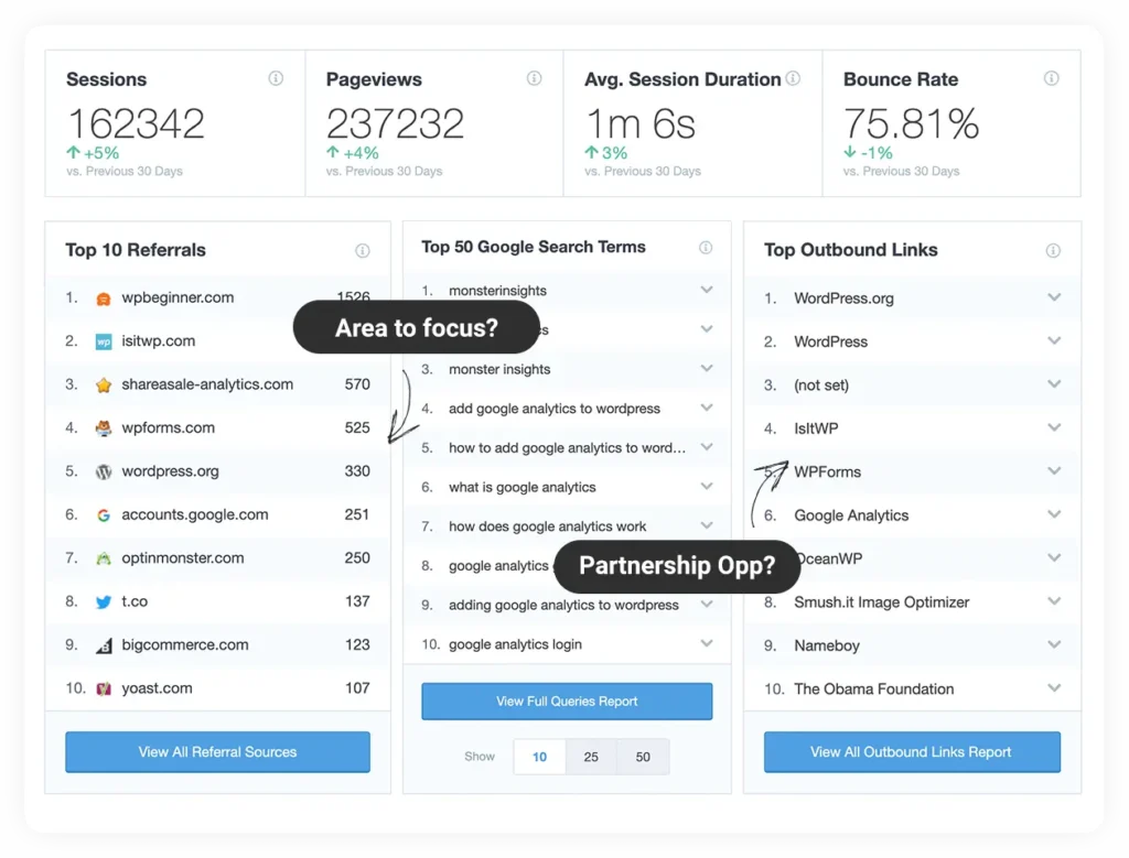 MonsterInsights Behavior Report shows you exactly how people found your website, which keywords they searched for, who referred them, what they clicked on site, and more.