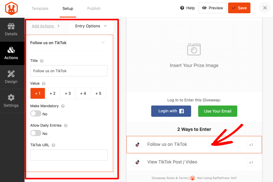 On the left, you can edit the name of the entry action, choose how many entries in the giveaway each action will earn, decide whether it’s mandatory, and customize the amount of daily entries allowed. You’ll also provide the TikTok URL to follow or post/video to embed.