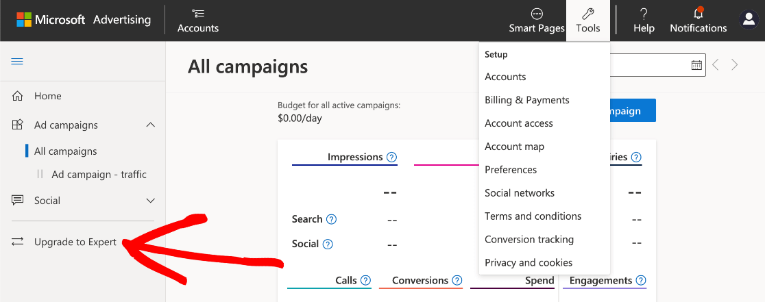 As promised, you won’t need any code to set up Bing conversion tracking. Just head back to your Microsoft Ads account in a new tab. Click Tools » UET Tag.