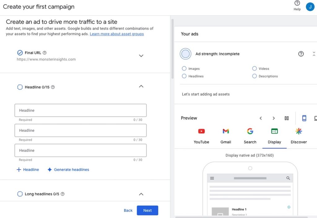 Note that you can create up to 15 different headlines, 5 different long headlines, and 5 different descriptions. These will be mixed and matched as Google sees fit based on what the search query and search intent are.