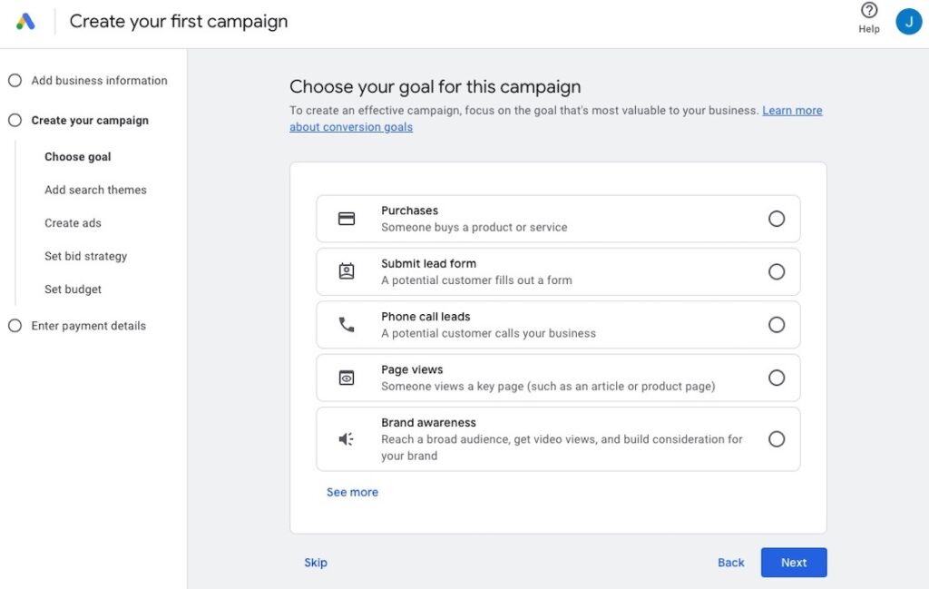 For most local businesses, prioritize goals that generate phone calls or lead form submissions rather than general brand awareness.