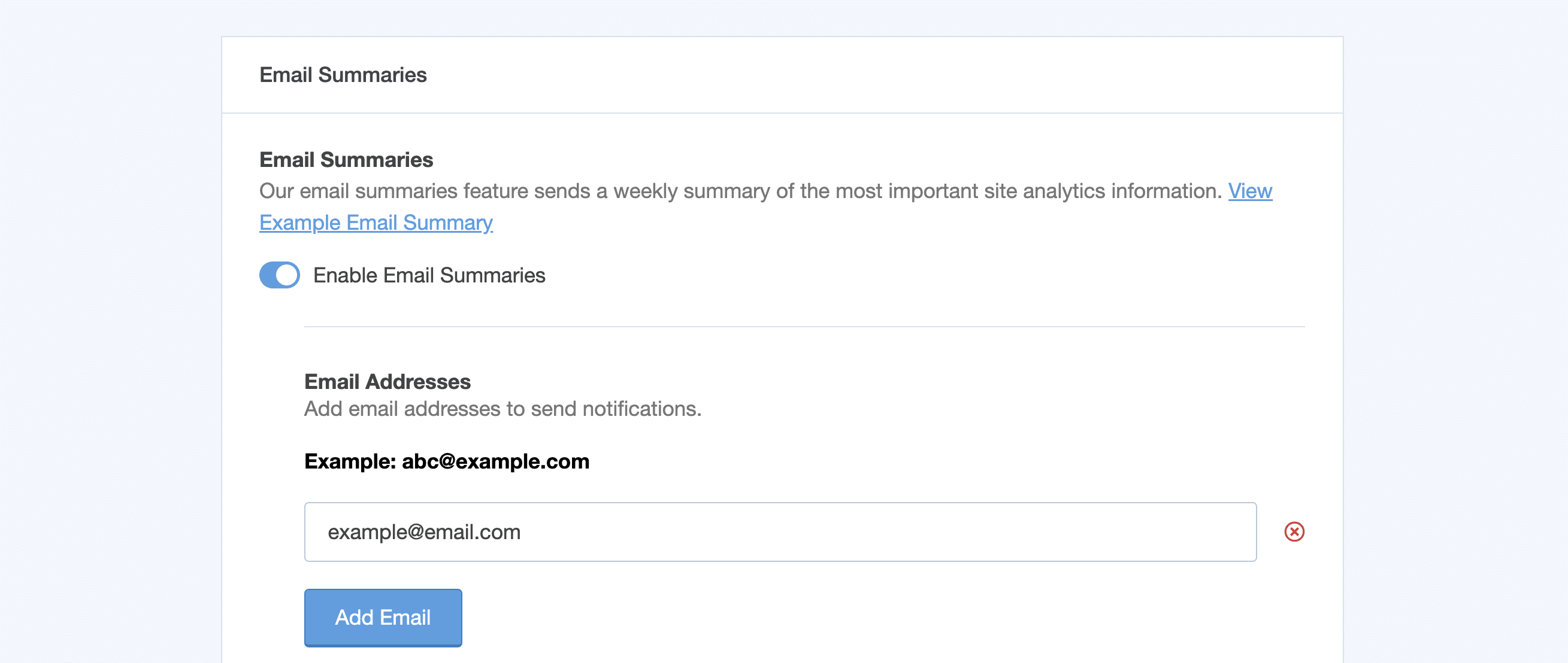 Configure your Email Summaries and get a snapshot of your website’s performance or send a copy of the email summary report to your client at Insights » Settings » Advanced » Email Summaries.