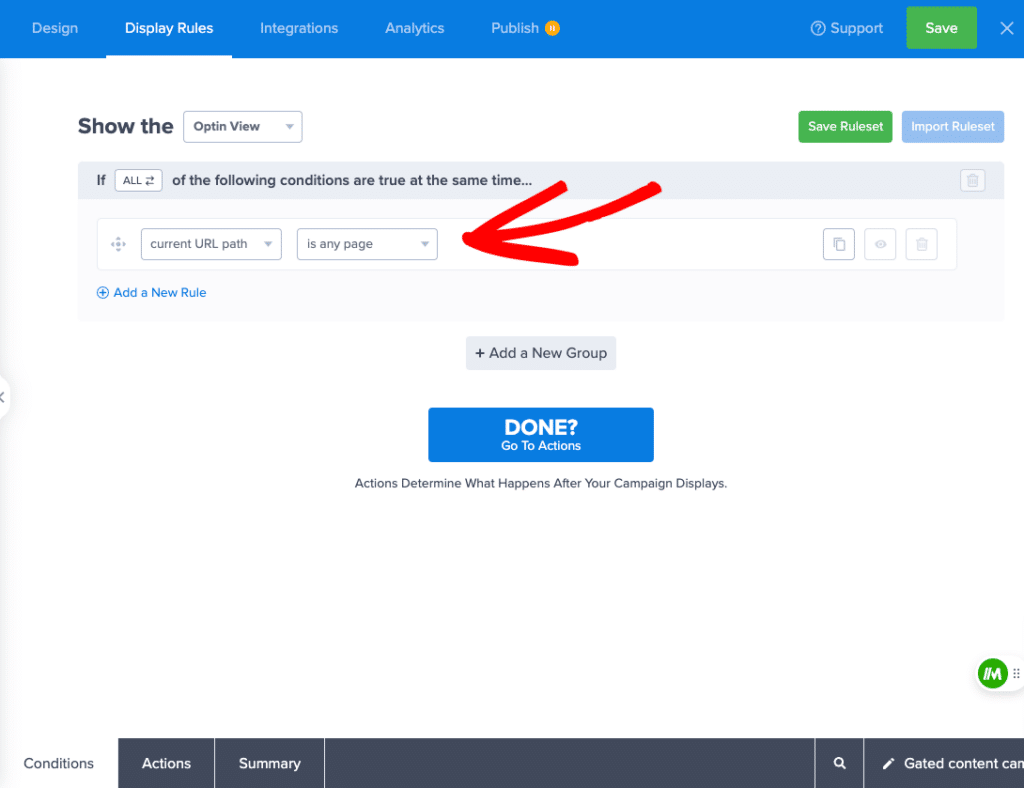 OptinMonster lets you control exactly where and when your gated content appears. Most likely, you want to configure it to lock a certain page. To do that, head to the Conditions tab and put the correct URL in the “is any page” box: